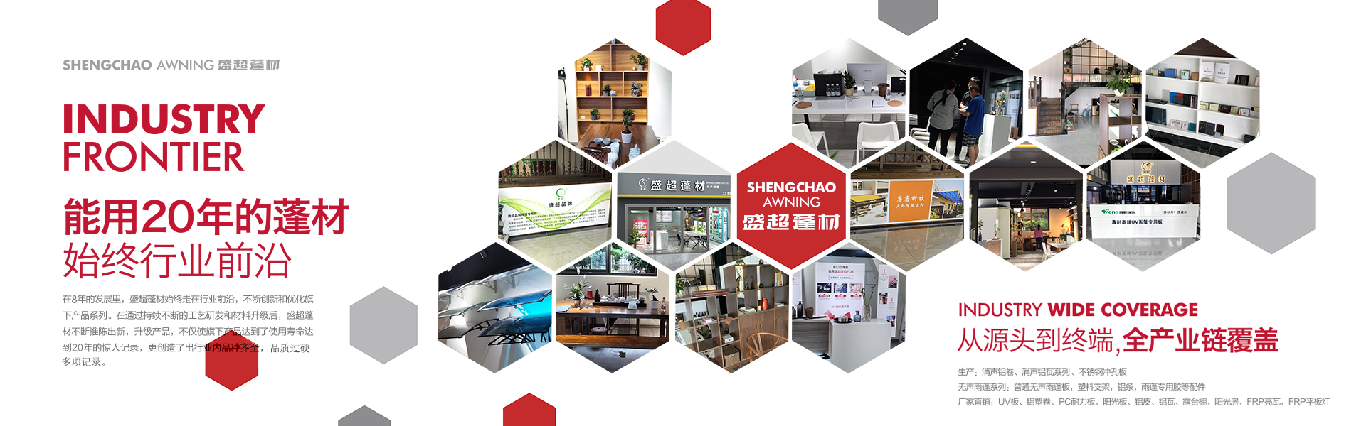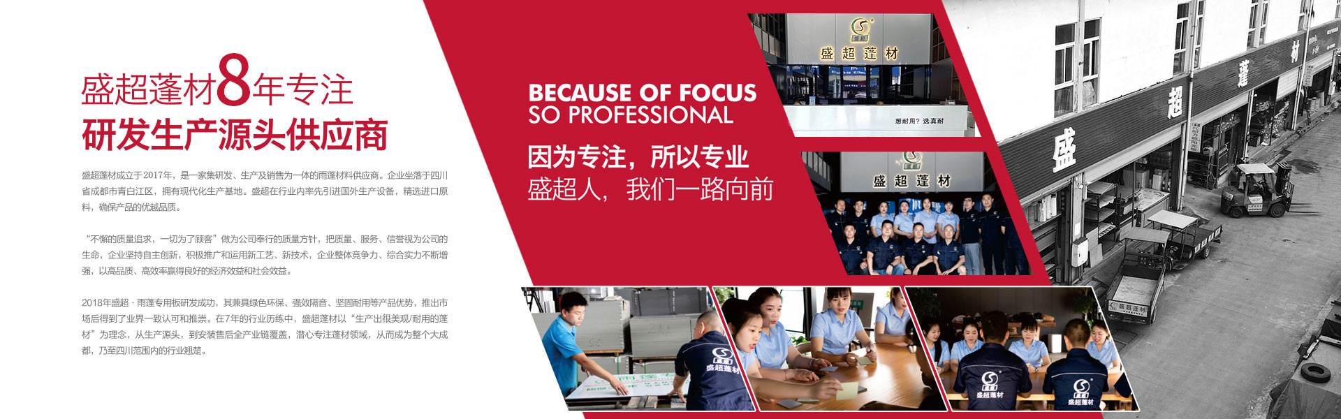 盛超蓬材是由四川超諾商貿有限公司創辦,是一家集研發、生產、銷售和服務于一體的專業雨蓬供應商。主要產品:實心耐力板,中空陽光板、多層板、蜂窩板、鋁瓦、消聲鋁瓦、不銹鋼消聲等材料的雨蓬產品。自主研發多款雨蓬,擁有自己的專利和檢測報告。其中明星產品新型組裝式雨蓬,擁有組裝簡便,美觀耐用、抗噪音,性價比高等優勢,多項檢測指標領跑同行業。受到了市場和經銷商的高度認可。 公司自成立至今,從銷售到研發再到生產,已經過了3次跨越式的發展。2017年已成為四川雨蓬行業內庫房面積大,員工多的一家公司。產值每年以平均20%的速度快速增長。可以說客戶是我們的老師,和他們合作使我們得到很多的學習機會來提高自身的技術水平和管理水平,是我們生產和發展的動力。